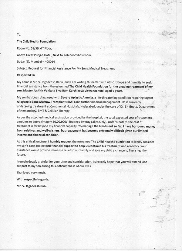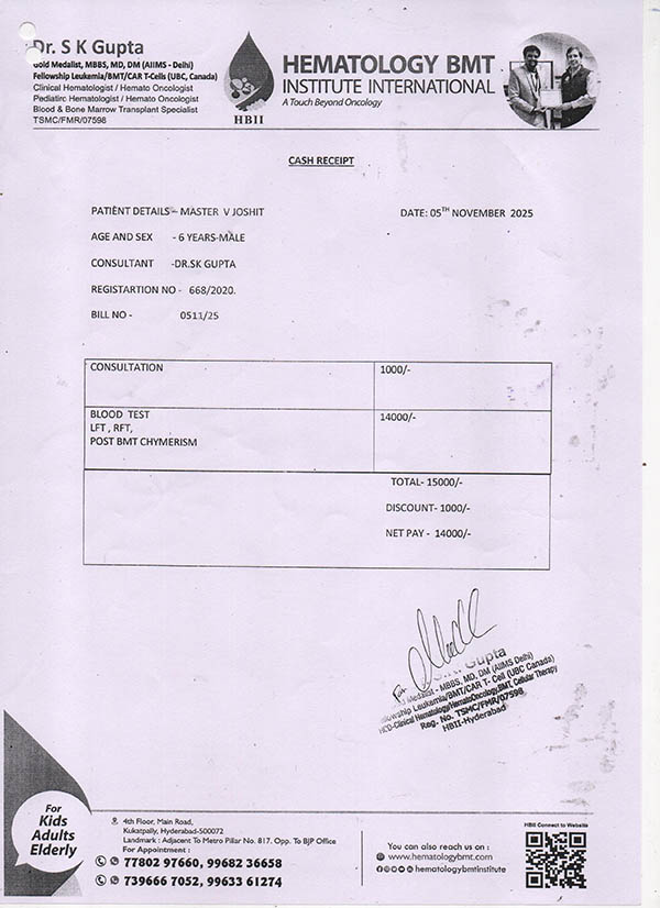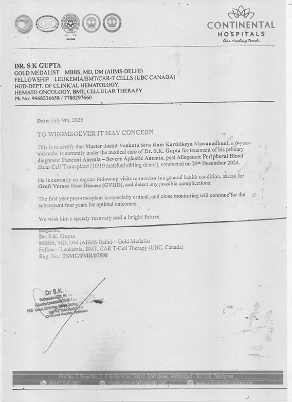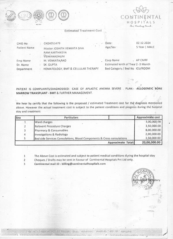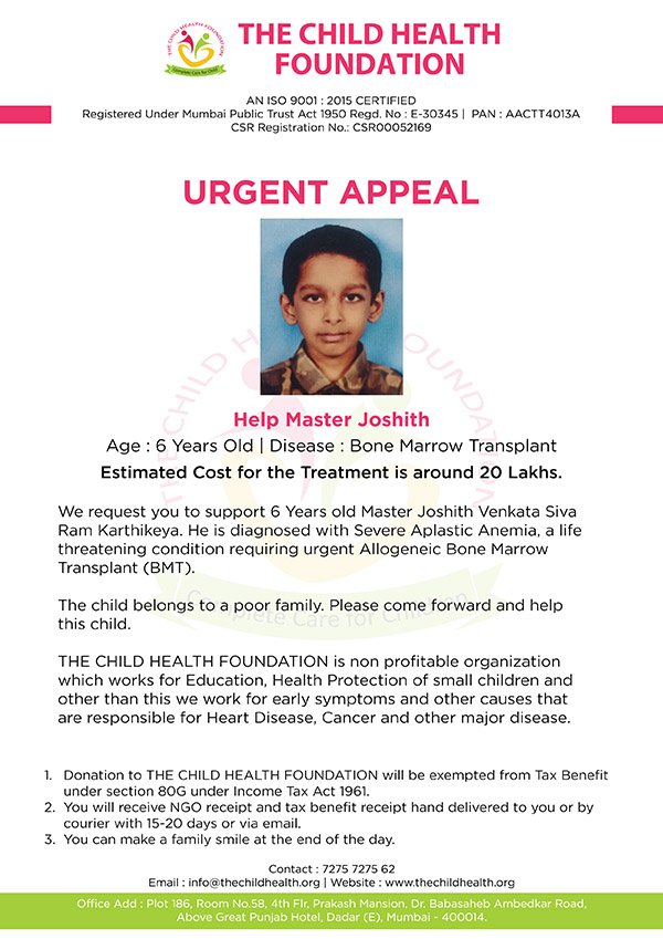 We request you to support 6 Years old Master Joshith Venkata Siva Ram Karthikeya. He is diagnosed with Severe Aplastic Anemia, a life threatening condition requiring urgent Allogeneic Bone Marrow Transplant (BMT).