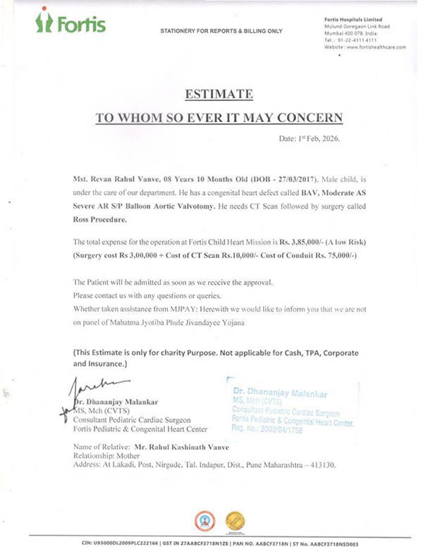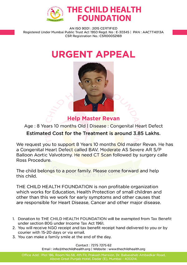 We request you to support 8 Years 10 months Old master Revan. He has a Congenital Heart Defect called BAV, Moderate AS Severe AR S/P Balloon Aortic Valvotomy. He need CT Scan followed by surgery calle Ross Procedure.