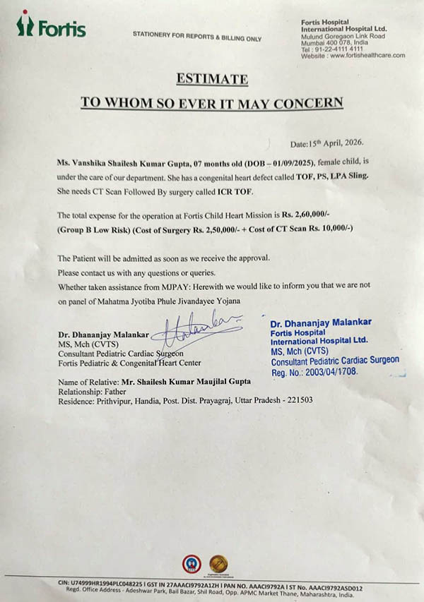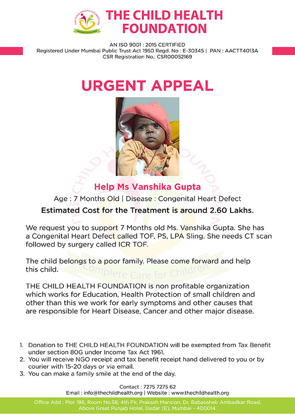 We request you to support 7 Months old Ms. Vanshika Gupta. She has a Congenital Heart Defect called TOF, PS, LPA Sling. She needs CT scan followed by surgery called ICR TOF.